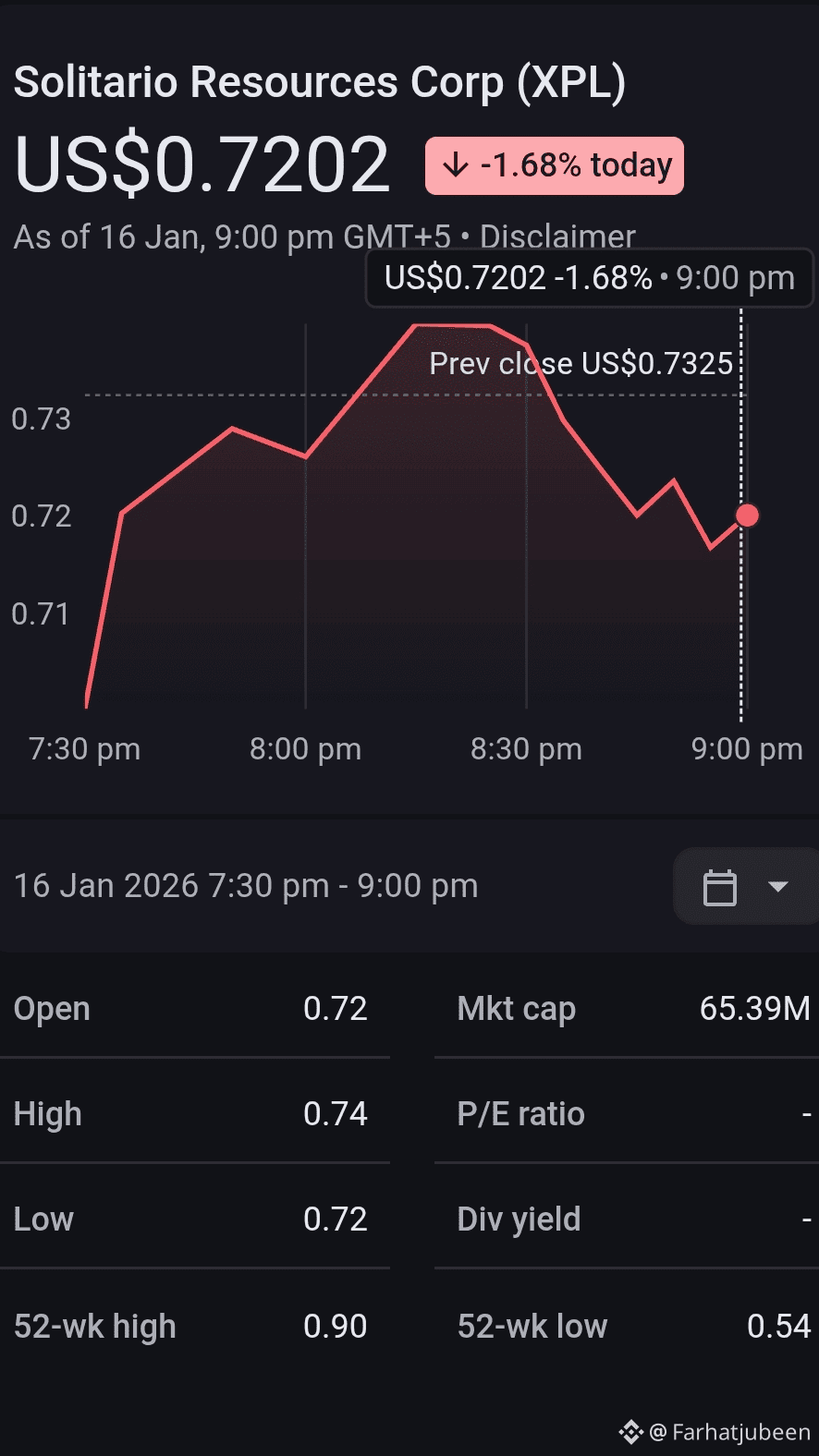 The stock for Solitario Resources Corp (XPL), a precious and base metal exploration company, is trading at approximately $0.72 USD as of January 16, 2026.