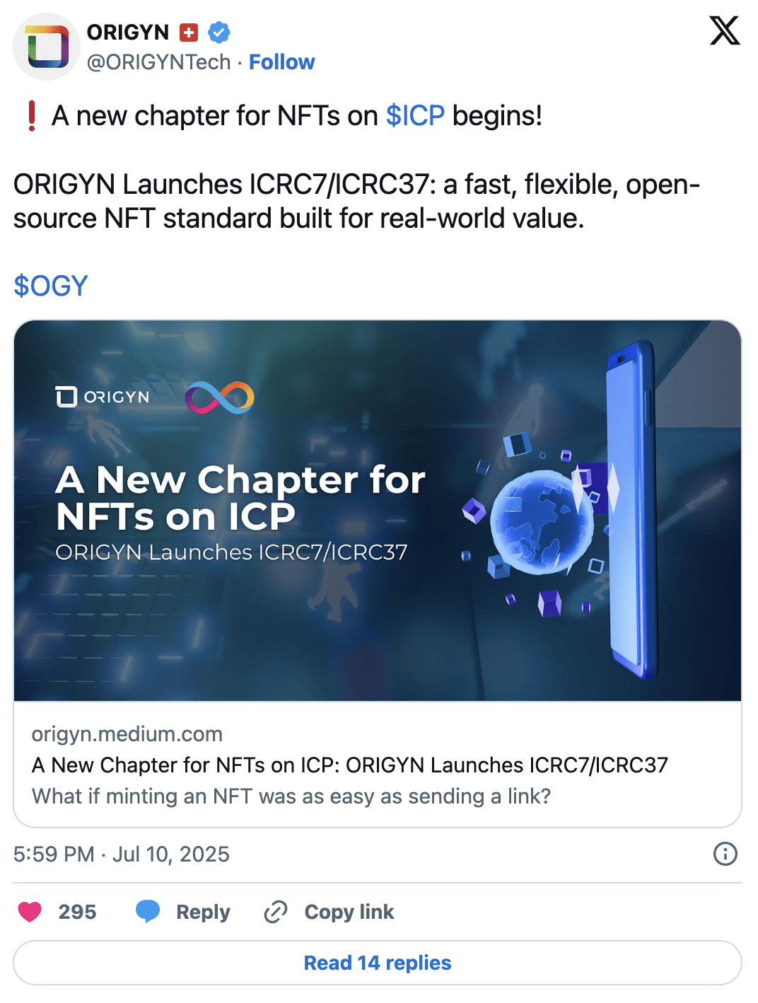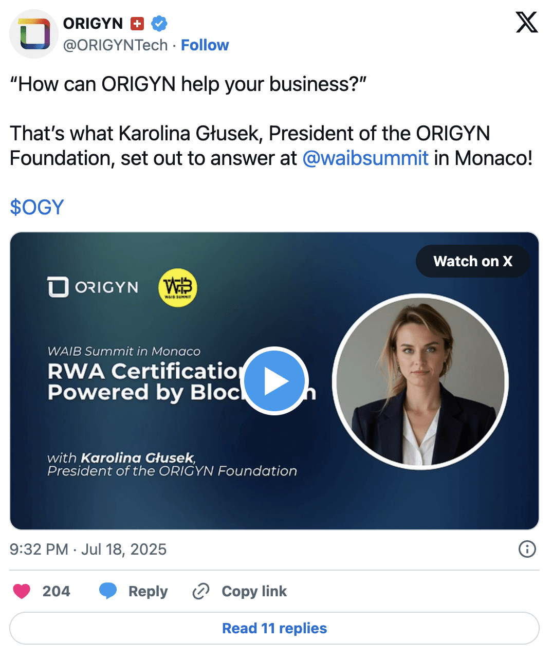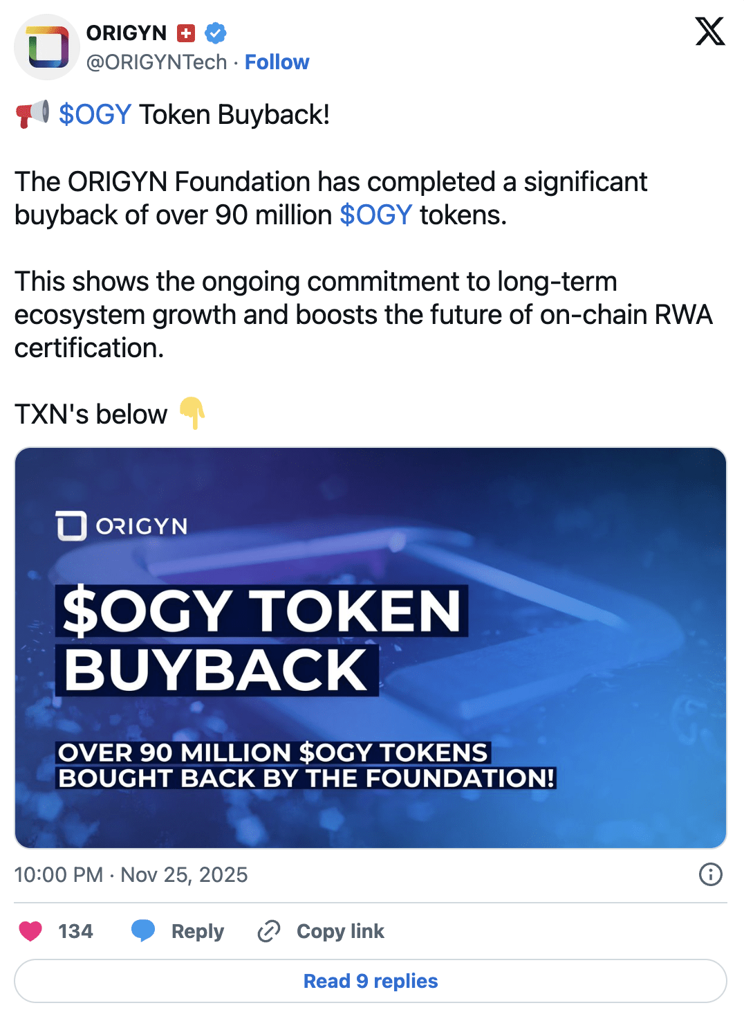 战略代币支持:ORIGYN 完成了一笔重要的 OGY 回购,以支持生态系统信心和长期协议稳定性,这表明基金会持续致力于可持续发展。