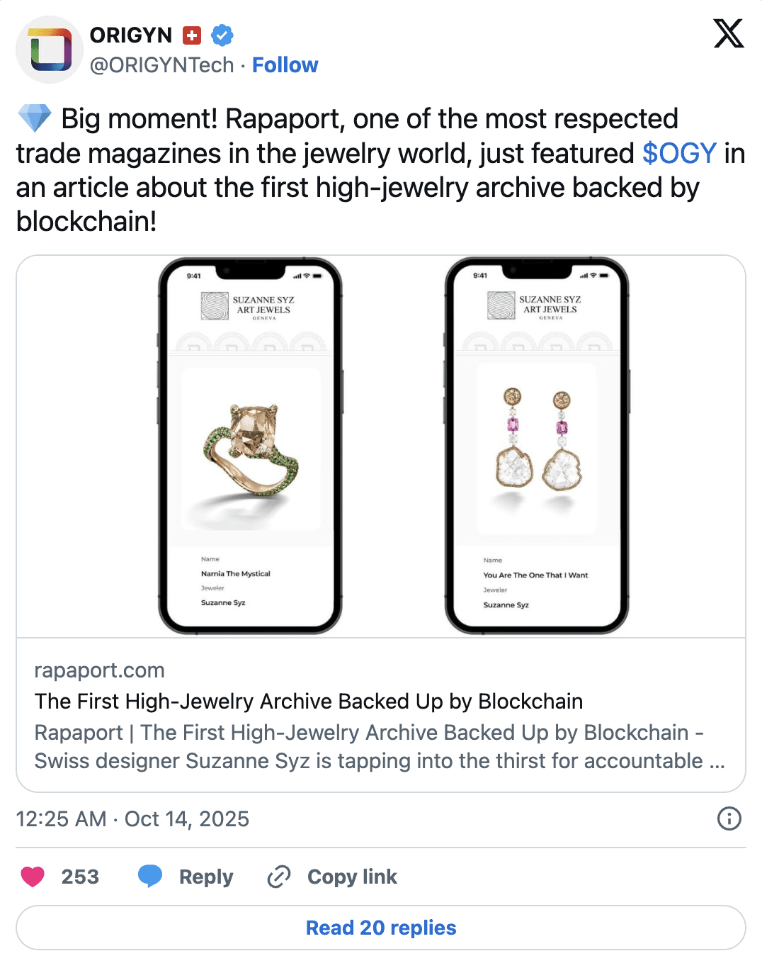 这些进展为 ORIGYN 从早期技术突破到切实生态系统扩展的一年发展势头画上了圆满的句号,使该协议成为认证数字资产的首选标准。