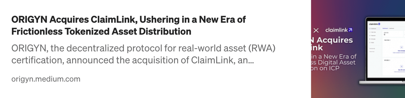 ClaimLink 收购:ORIGYN 收购 ClaimLink 以简化代币和证书分发,提供 Web2 风格的用户体验和 Web3 级别的去中心化。