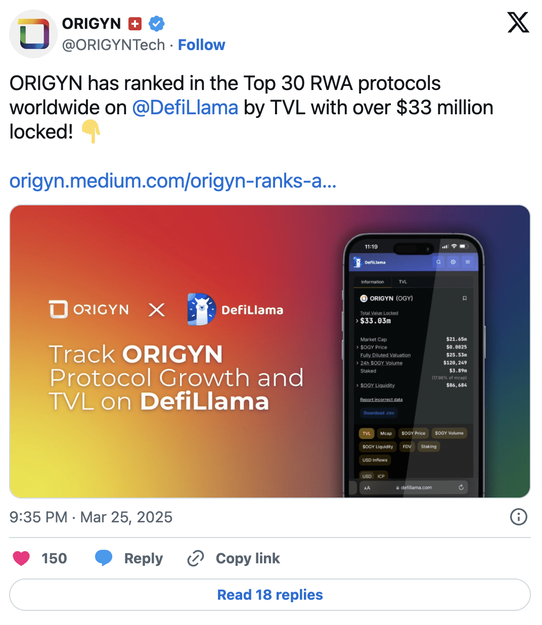 ORIGYN 被评为全球前 30 大 RWA 方案之一:ORIGYN 被 DeFiLlama 评为全球前 30 大 RWA 方案之一,这表明我们的长期愿景正在更广泛的市场中得到实现。