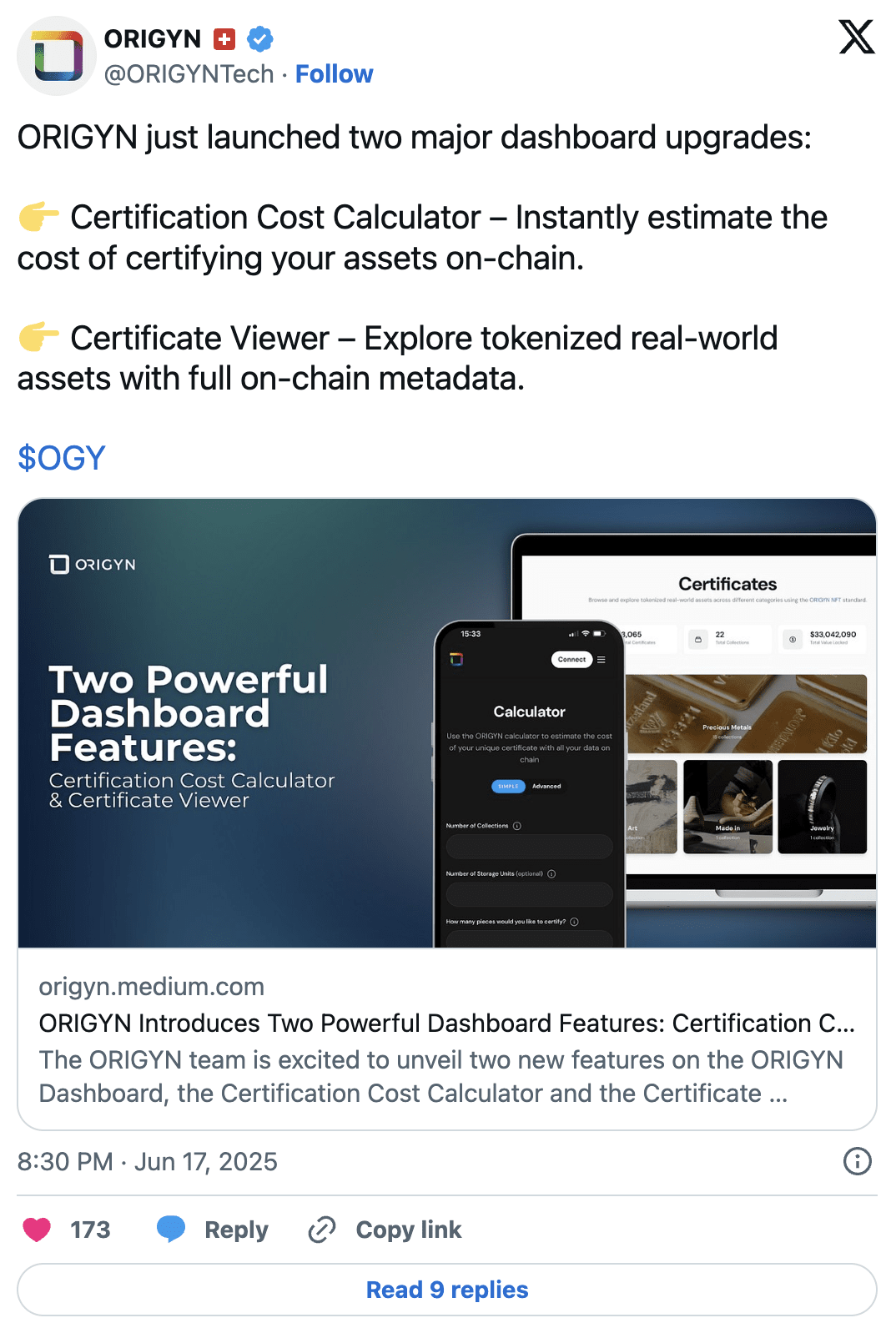 新网站上线:ORIGYN 推出了全新的网站,重点在于清晰度、生态系统统计数据以及面向创作者、品牌和认证机构的入门工具。