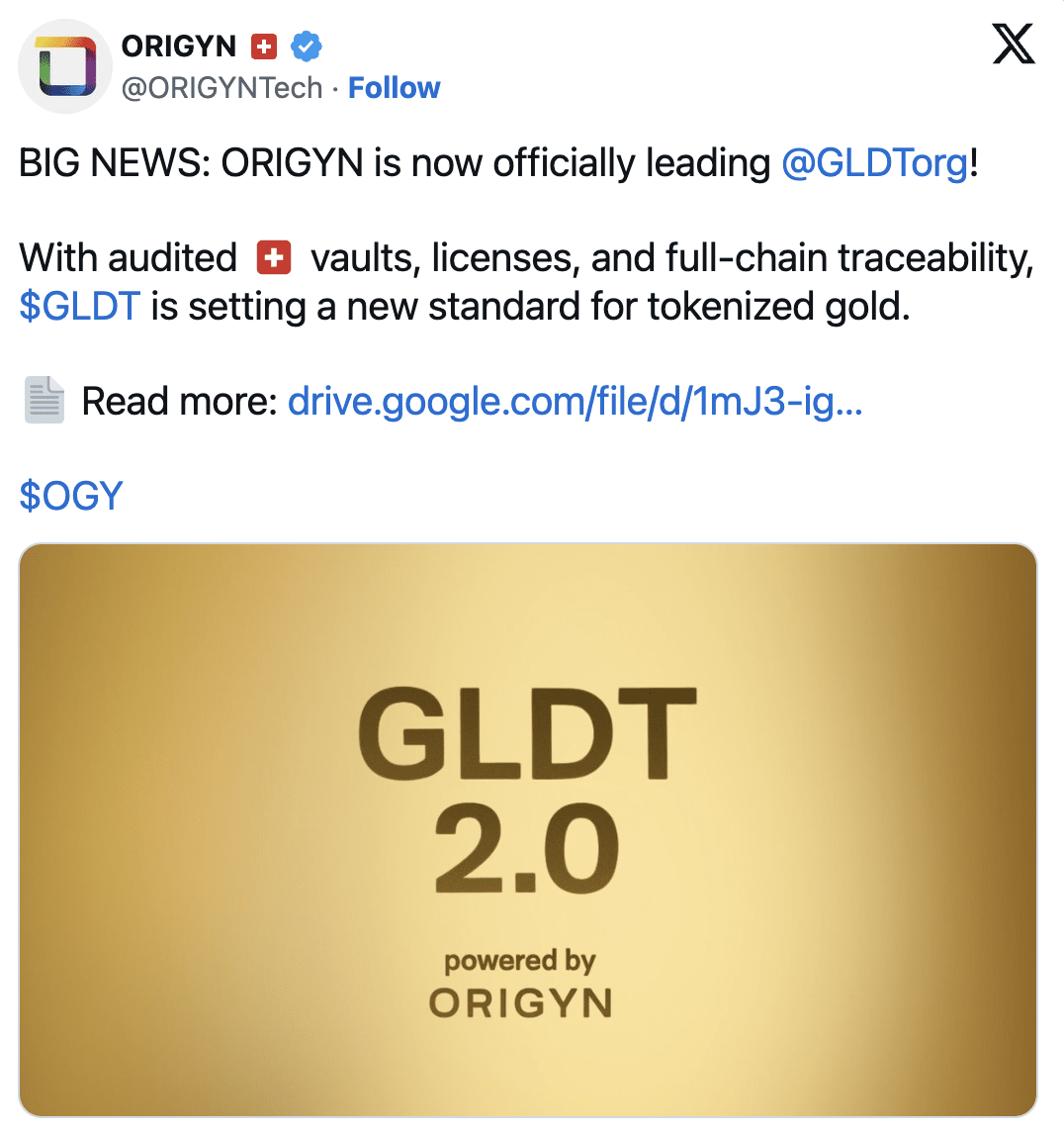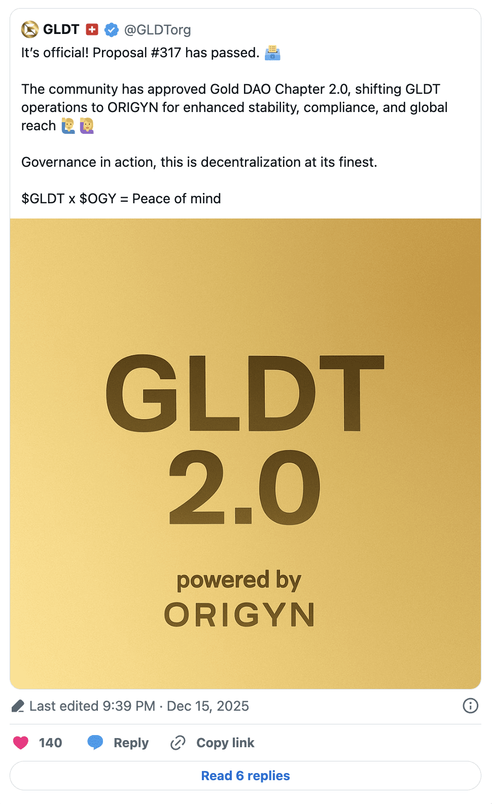 GLDT 的管理:经 GoldDAO 投票表决,ORIGYN 基金会正式成为 GLDT 的发行方,此举将最值得信赖的代币化黄金资产之一纳入 ORIGYN 的机构级基础设施,并配备瑞士金库审计和链上可追溯性,进一步巩固了我们在 RWA 代币化领域的领先地位。