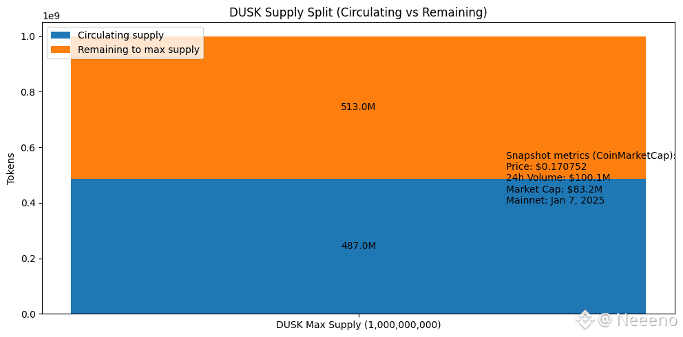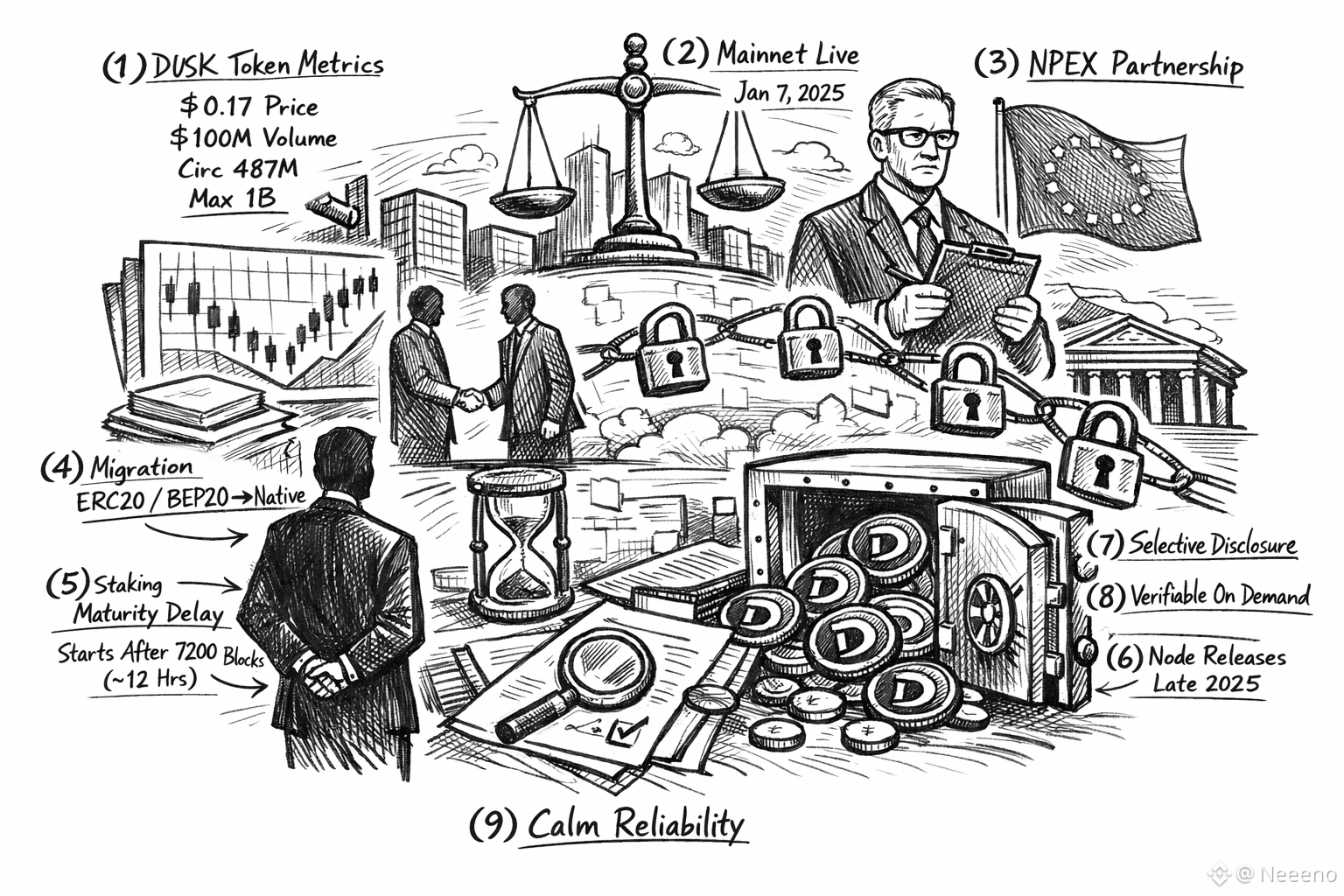 If you want to be honest about Dusk, you have to say this: it’s built to be dependable, not entertaining. Around mid-January 2026, it’s near $0.17, doing roughly $100M in 24-hour volume, with about 487M tokens circulating out of a 1B maximum. That kind of data can create a lot of chatter. But the real signal is in the timeline: January 7, 2025 turned important mainnet work into something real, development kept moving through late 2025, and the commercial direction stays tied to regulated finance and market infrastructure rather than abstract theory.
