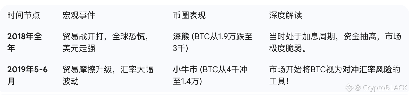 启示: 贸易战初期是恐慌下跌(杀估值),中后期一旦确立了“放水对抗衰退”的基调,或者是汇率战开启,比特币就会像弹簧一样反弹。