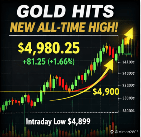 Gold $XAU surged to a fresh all-time high on Friday, reclaiming strong bullish momentum after a brief pullback earlier in the session. Prices rebounded sharply from an intraday low near $4,899, trading around $4,980 at the time of writing and marking a third straight weekly gain.