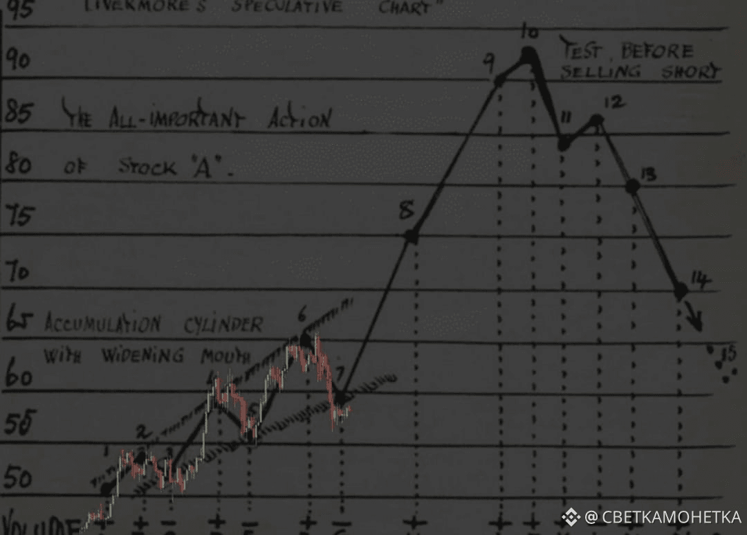 Accumulation Cylinder (Цилиндр накопления): В левой части (пункты 1–6) показана фаза консолидации, когда цена колеблется в расширяющемся диапазоне. Ливермор называл это периодом, когда крупный капитал набирает позицию.