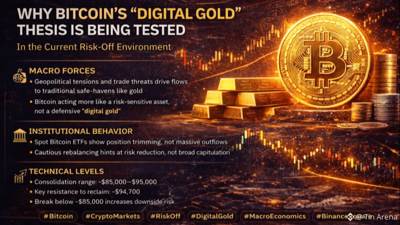 $BTC is once again under pressure as global markets shift into a risk-off posture. Rising geopolitical tensions, renewed trade threats led by the United States, and persistent macro uncertainty have pushed investors toward traditional safe havens—notably gold and silver—both of which continue to set new highs. In contrast, Bitcoin’s long-promoted “digital gold” narrative has failed to deliver comparable protection in this phase of market stress.