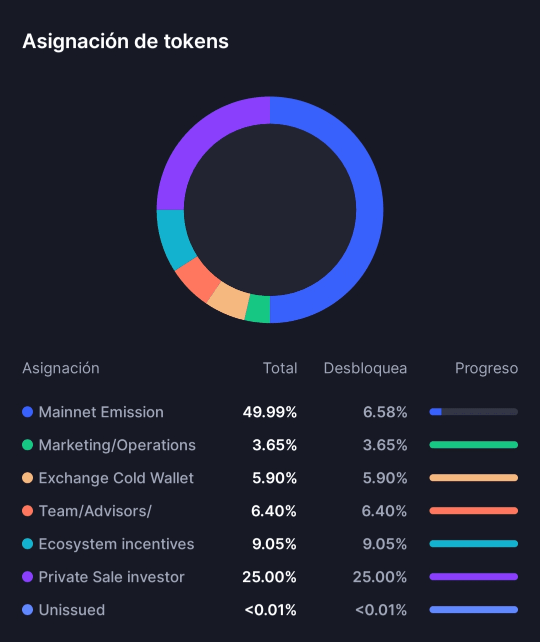 Con un total de 19.52k de holders 565.90M desbloqueados y teniendo bloqueados 434.09M de tokens. Con una capitalización de 93.55M.