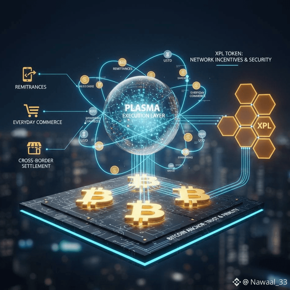 Bitcoin becomes the layer of finality and trust the place where history is settled and cannot be rewritten. Plasma becomes the execution layer where payments, transfers, and stablecoin activity happen quickly and cheaply.