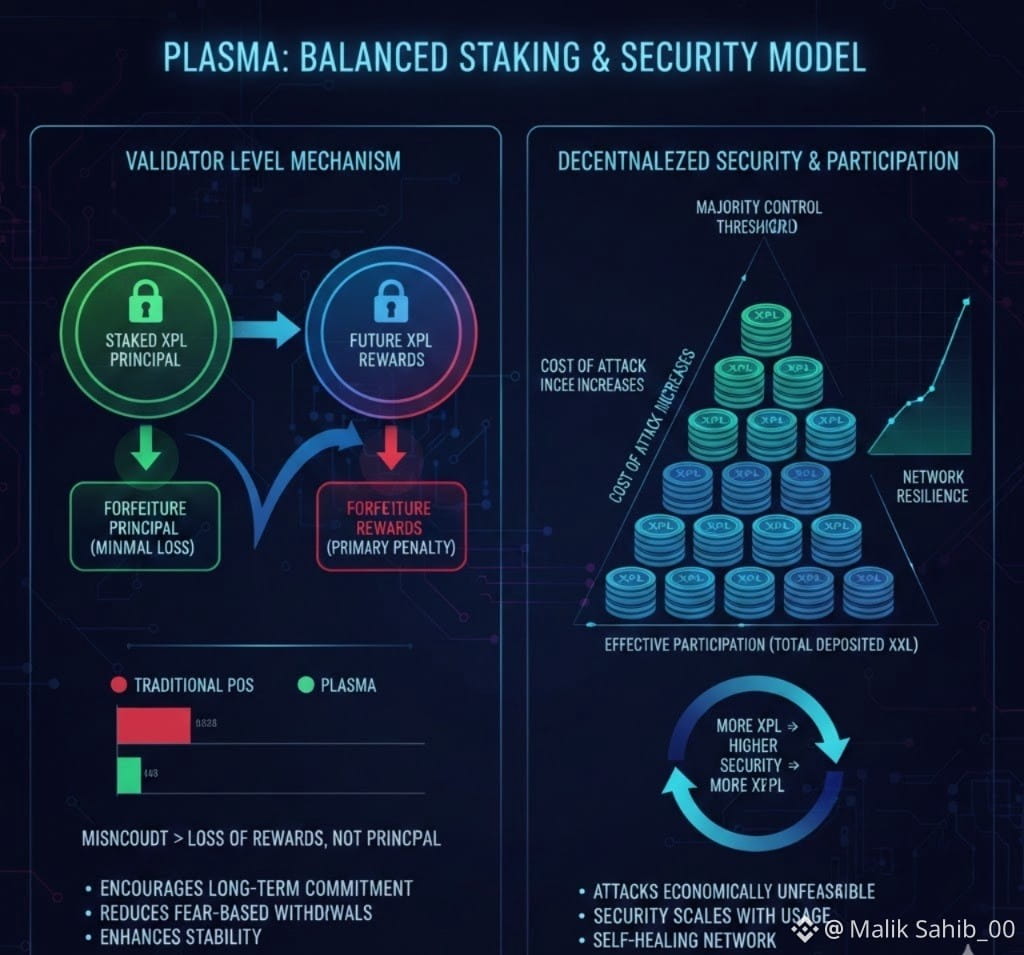 At the validator level, Plasma offers a balanced staking and forfeiture mechanism. Validators must lock a significant amount of XPL to participate in the consensus process and validate blocks. Unlike PoS systems that overly rely on forfeiture of collateral, Plasma prioritizes forfeiture rewards over forfeiture principal. This means that misconduct primarily results in the loss of future rewards, rather than the permanent loss of staked assets. My analysis suggests that this design encourages long-term commitment, reduces withdrawals due to fear, and enhances validator stability without compromising network security.