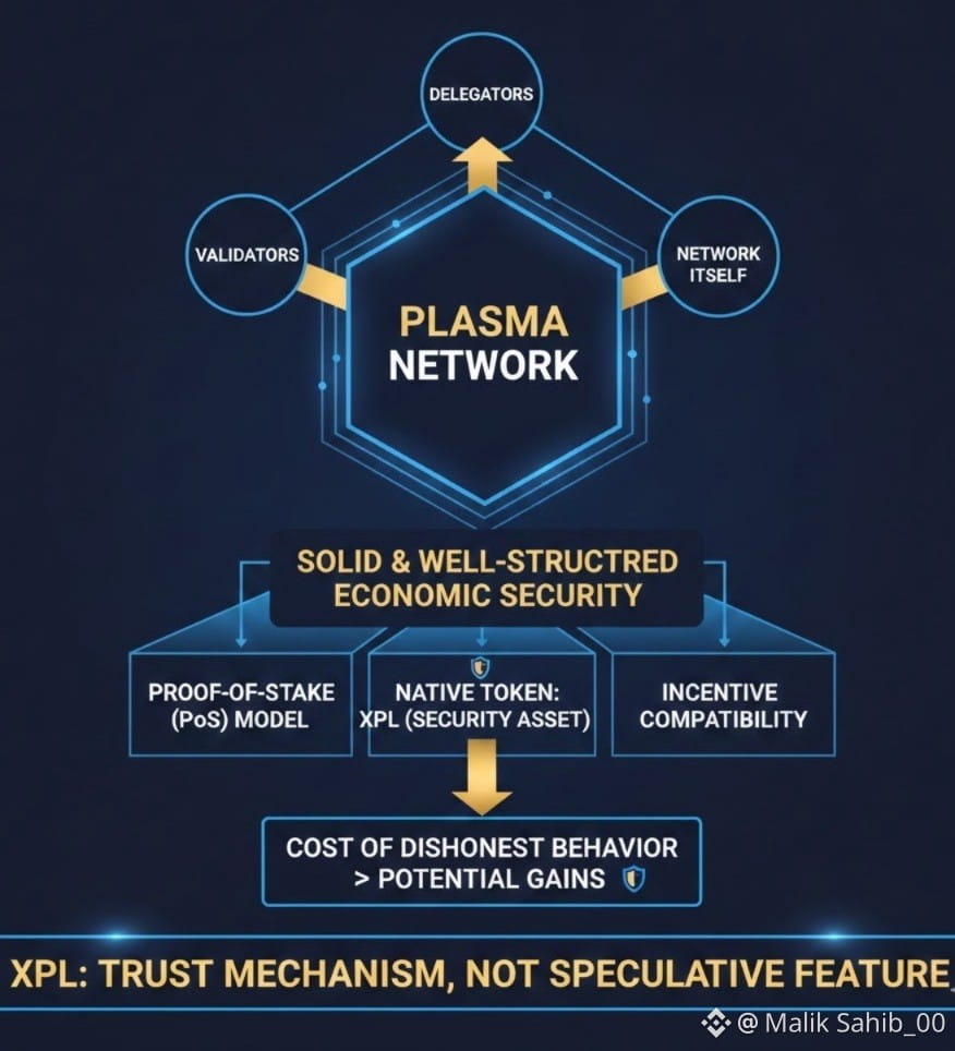 I believe the economic security of the Plasma network is a solid and well-structured foundation, not merely a noisy and speculative feature. Plasma is based on a Proof-of-Stake (PoS) model, with its native token, XPL, as the primary security asset. By staking XPL, validators, delegators, and the network itself are economically compatible, ensuring that the cost of dishonest behavior far outweighs any potential gains. This compatibility of incentive mechanisms transforms XPL from a simple token into a trust mechanism.