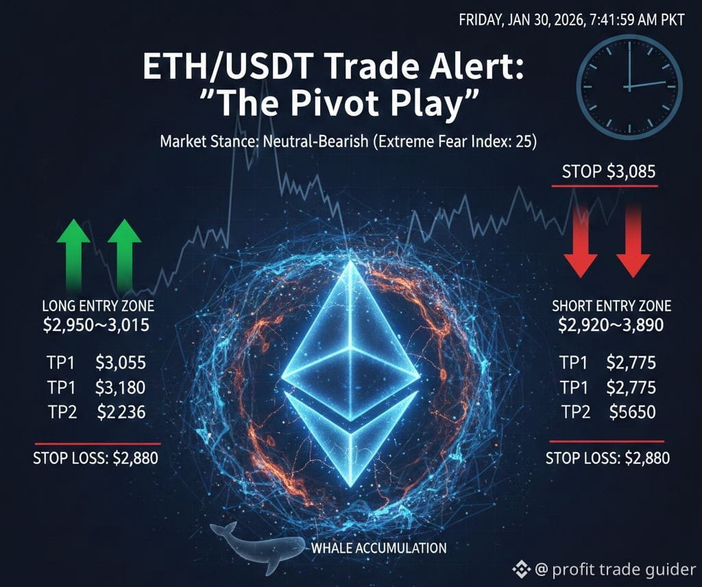 $ETH As of January 30, 2026, Ethereum is trading in a "volatility trap." While it is currently holding above the $2,950 mark, the market sentiment is characterized by "Extreme Fear" (index at 25) due to Bitcoin's failure to maintain $88k.