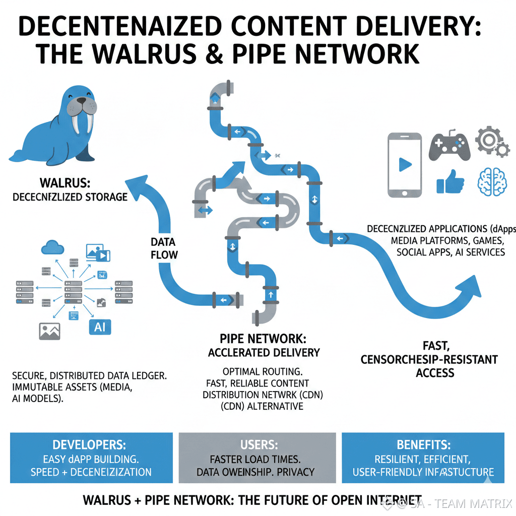 The @Walrus 🦭/acc and Pipe Network are doing something with how content is delivered over the internet. They are trying to get rid of the problems that used to slow things down. The Walrus and Pipe Network are combining storage that is not controlled by one person with a way of sharing content that works well. This makes it feel like the systems that deliver content quickly but it also keeps things open and safe for the people using it. The Walrus and Pipe Network are good, for things that need to be accessed and delivered in a way that is reliable.