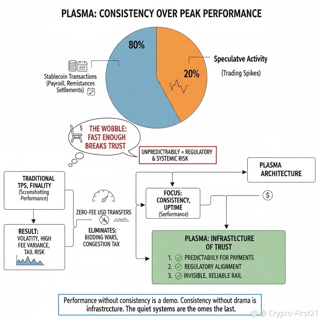Most systems don’t fail because they lack ambition. They fail because they lack discipline. They build impressive furniture and forget the stabilizers underneath. Plasma isn’t trying to impress you today. It’s trying to stay standing when nobody is watching. Performance without consistency is a demo. Consistency without drama is infrastructure. The quiet systems are the ones that last, and fast enough is usually where the wobble begins.