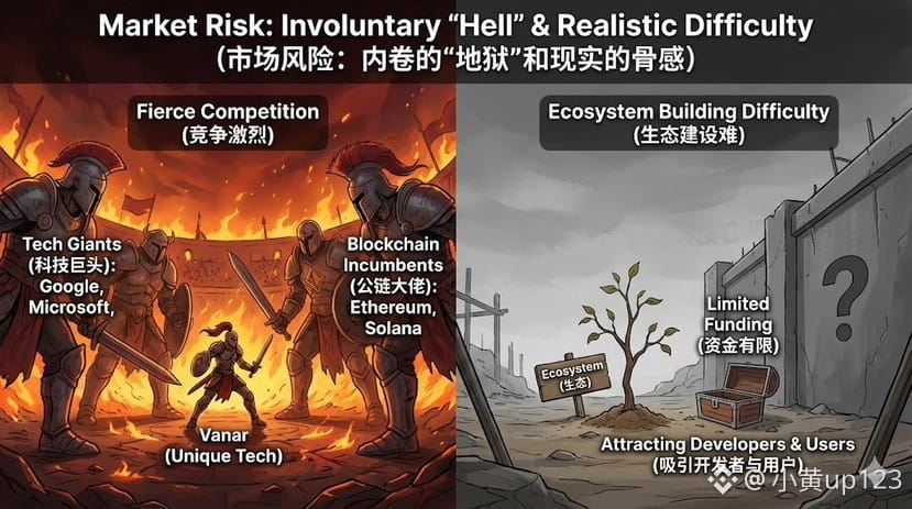 1. 竞争太激烈了: AI+Web3是兵家必争之地。外面有谷歌、微软这样的科技巨头虎视眈眈;内部有以太坊、Solana这些公链大佬随时可能发力。Vanar就像一个有独门武功的少年,但要面对的是整个江湖的顶尖高手。