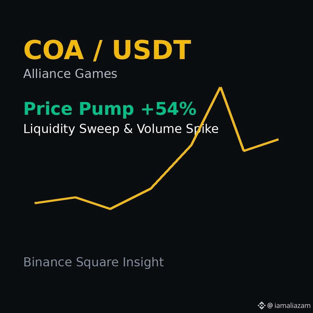 $COA (Alliance Games) has entered the spotlight after recording a sharp +54% price surge, drawing attention from traders across the on-chain and spot markets. This move was not random and can be explained through a combination of liquidity dynamics, low market capitalization behavior, and aggressive short-term participation.