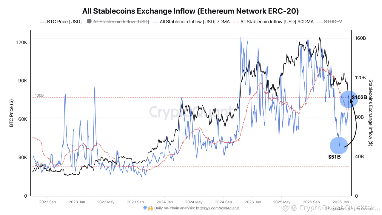 As BTC gradually approaches a 50% correction from its October all time high, we can see that stablecoin inflows to exchanges are increasing 📈