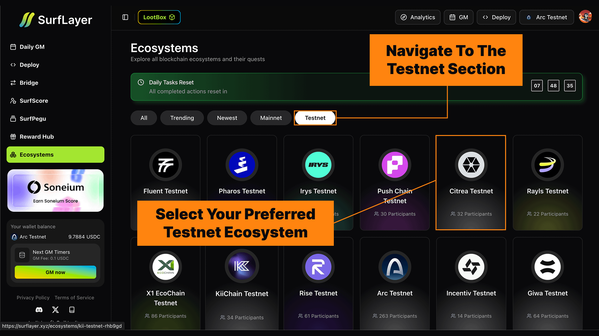 Navigate to the Testnet section