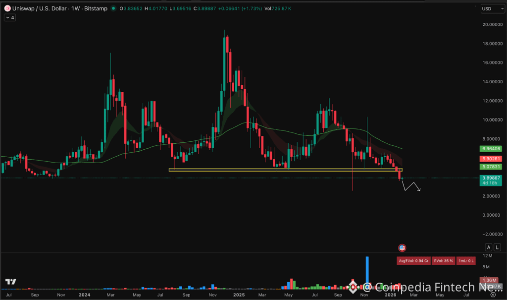 Uniswap (UNI), one of the top blockchain projects in the decentralized exchange sector, has lost all momentum over the past few months. UNI briefly challenged the $6.5 level in late 2025, but it has since collapsed to $3.9 and is struggling to find support around that level.