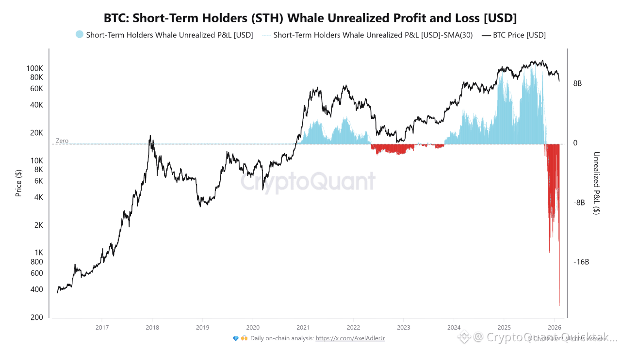 Data on short-term whale losses (STH Whale Unrealized P&L) shows that this segment is experiencing its largest unrealized loss in history, exceeding -$21 billion. This level reflects exceptional psychological and financial pressure on fast-moving capital and indicates that a significant proportion of whales that entered the market in recent months are now underwater following the sharp decline in Bitcoin’s price.