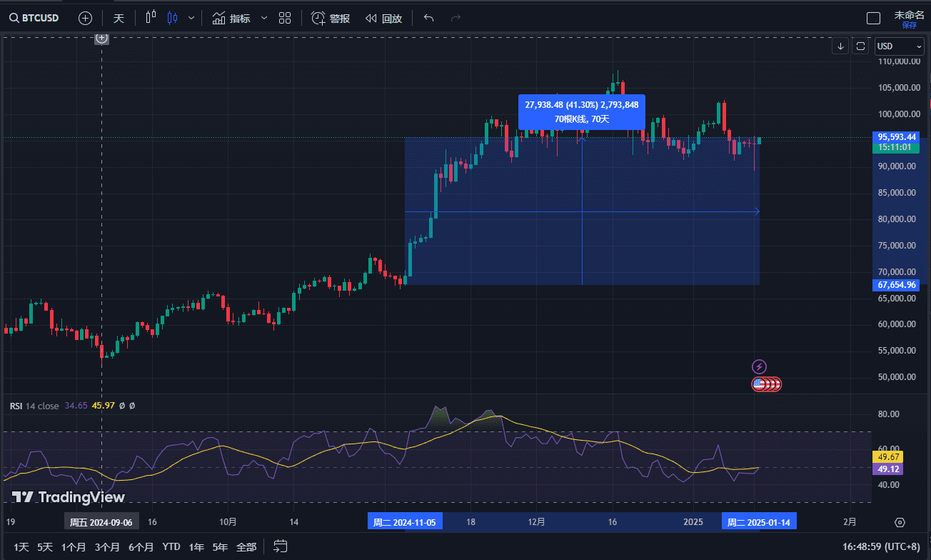 Recently, the SPX has given up more than 4% of its gains in January, while Bitcoin has remained relatively resilient, having gained more than 40% since hitting a low of $67,541 on Election Day 2024. Bitcoin is currently consolidating around the $95,000 support level.