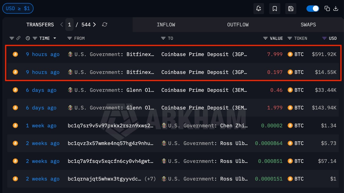 Recently, a wallet transfer from the U.S. government has once again attracted market attention. According to on-chain data platform Arkham, the U.S. government transferred approximately $606,000 worth of Bitcoin to Coinbase Prime on April 16, sparking discussions about potential sell pressure in the market.