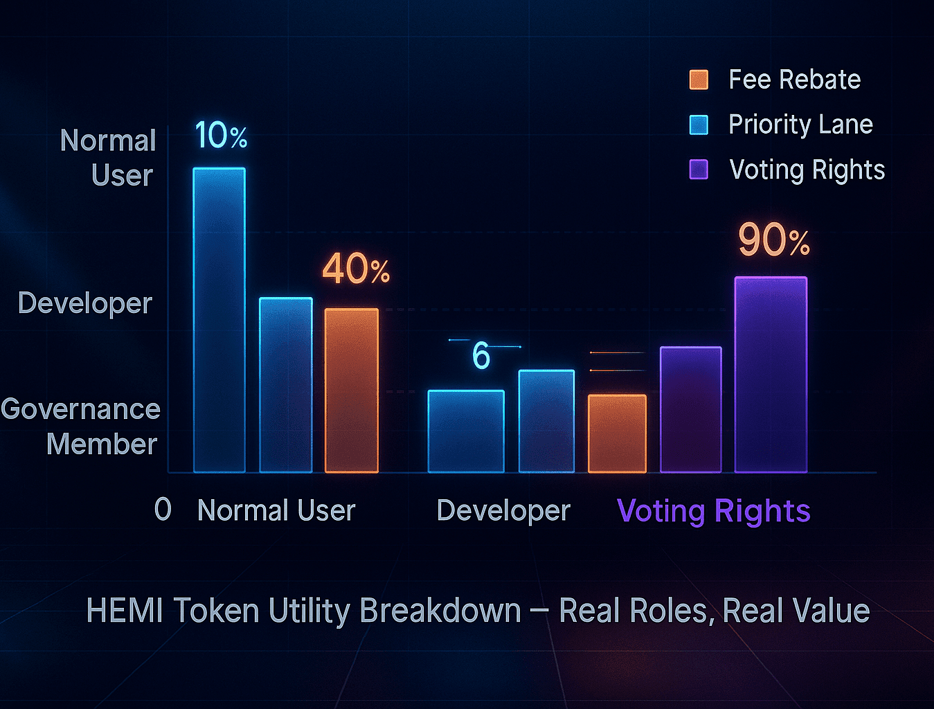 @Hemi The utility matrix is fundamentally focused on three roles: regular users who receive fee rebates and priority through holding; developers and LPs who receive grants and liquidity support for building; and governance members who have the right to propose and vote. Thus, the use of tokens for each role is kept clear and targeted, making the token ecosystem cohesive and practical.