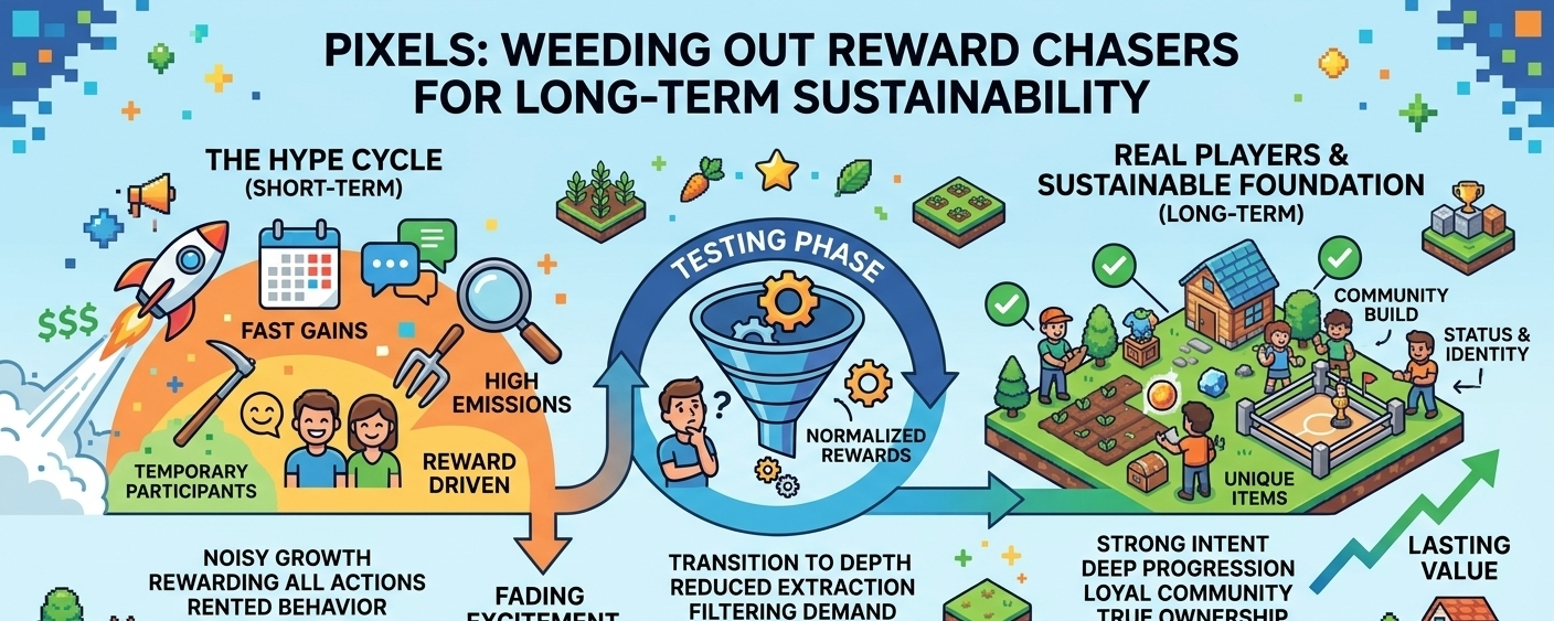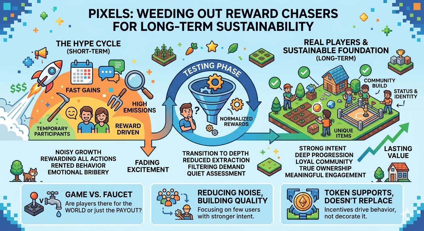 Crypto often misunderstands this because it worships visible growth. More wallets. More transactions. More volume. More mentions. But quantity without durability becomes expensive theater. Pixels may be choosing something harder: fewer users with stronger intent. That does not look exciting in the short term. Sometimes it is exactly what survival requires.