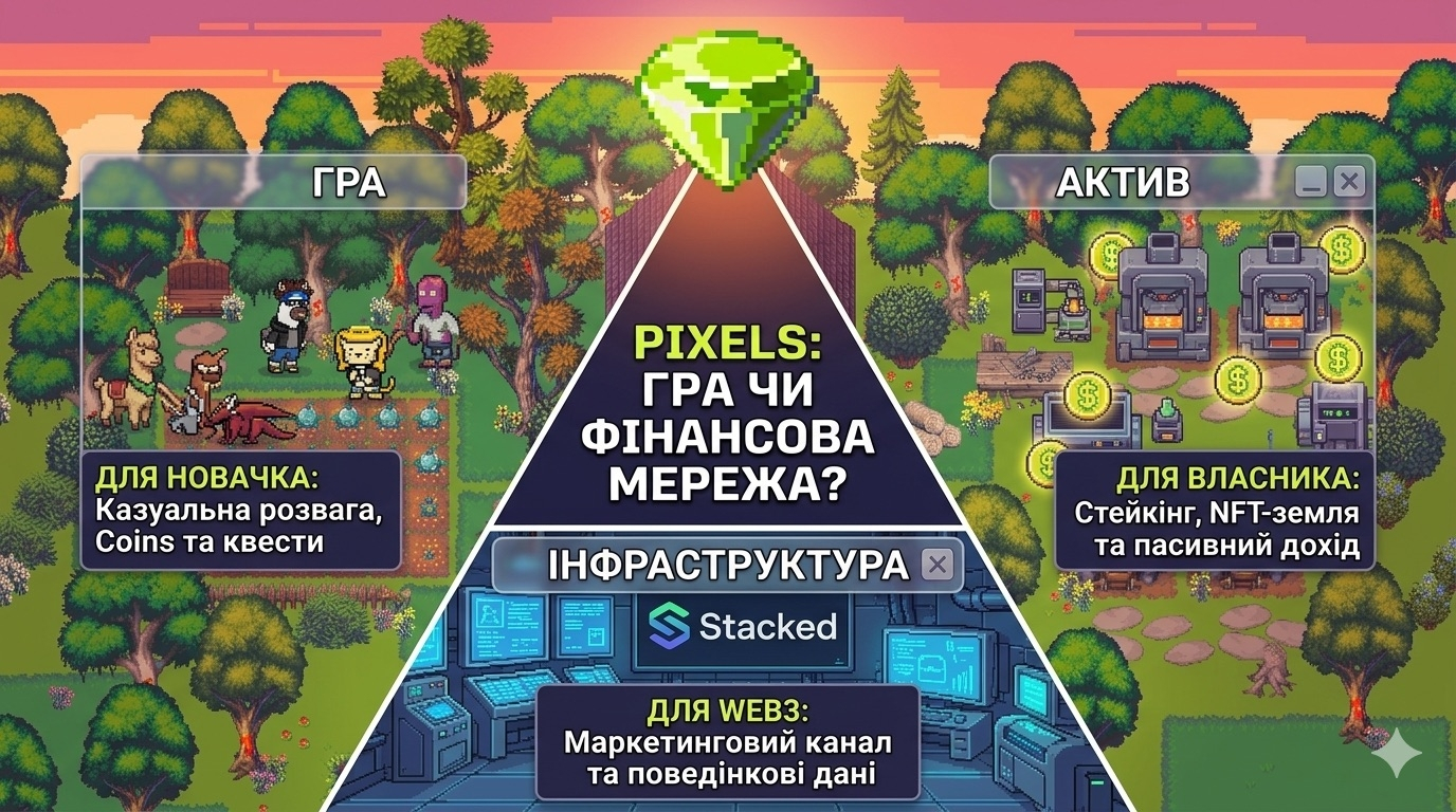 So where does the line lie? I think it's different for different people. For a newbie who just signed up - Pixels is a game, period. For NFT landowners with multiple plots and staking - it's a portfolio asset. For a studio connected to Stacked - it's a marketing channel. The same product, three different realities.