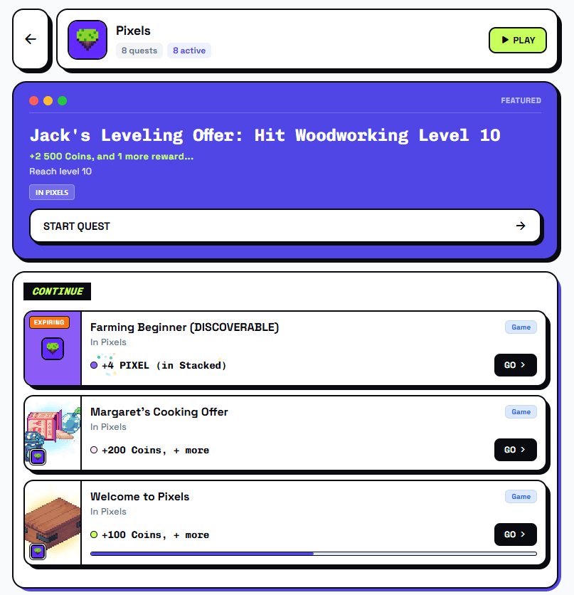 This morning I logged into @Pixels again, marking the fifteenth day in a row. I did the usual stuff: checked Infinifunnel, glanced at the Taskboard, and looked for new tasks in Stacked: