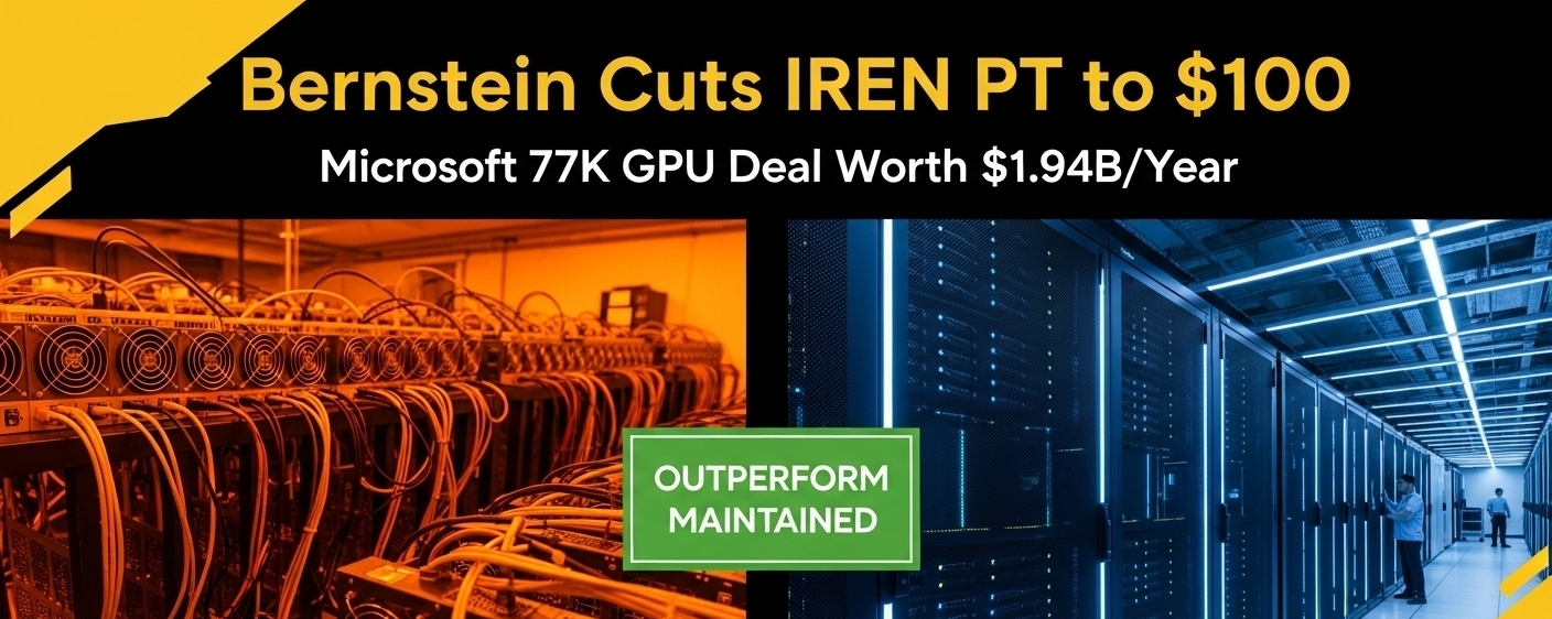 Bernstein revised its target on $IRENon from $125 to $100, while keeping an Outperform rating. The cut reflects softer Bitcoin mining activity and share dilution — not weakness in its AI strategy.