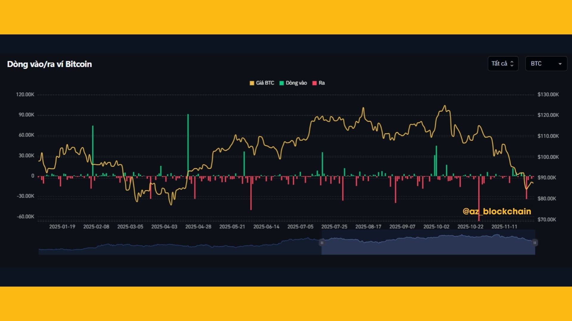 The inflow/outflow chart $BTC shows a fairly clear picture: the pressure to withdraw BTC (red outflow) is significantly stronger than the inflow (green), especially when the price adjusts from the $120K range to below $90K.