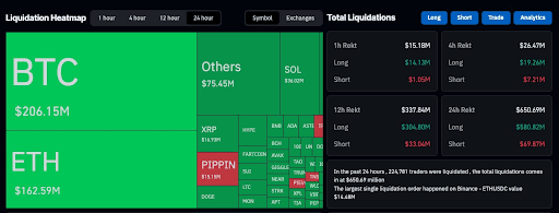 Coinglass recorded over 218,000 liquidated traders in 24 hours, with long positions dominating losses amid fast market movement and broken support areas.