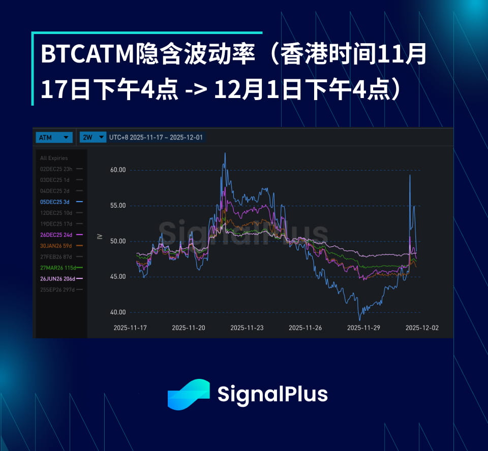 In the past two weeks, the implied volatility range has been very large, with the volatility of contracts with a term of less than 2 months soaring as the coin price approached the $80,000 low. This was followed by a sharp decline due to last week's low volatility slow correction upward, and then it rose again with a new round of selling starting from the $90.5–85.5K range during the Asian session. The actual volatility has remained high at 48–52%, so the decline in implied volatility can only be attributed to position reduction ahead of the year-end, while market makers hope to recover the selling flow of directional trades.