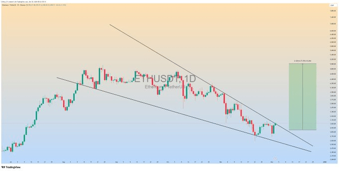 The daily ETHUSDT chart shows a falling wedge pattern forming over several weeks. Price action has compressed within narrowing trendlines, creating a setup that often precedes directional expansion. ETH currently trades near the upper boundary, where traders watch for confirmation above resistance.