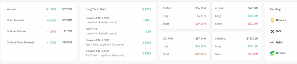 Liquidations remain concentrated on the short side. The past 24 hours show $85.02M in short losses versus $24.18M in long losses. This trend reflects upward pressure as bearish positions unwind across multiple timeframes.