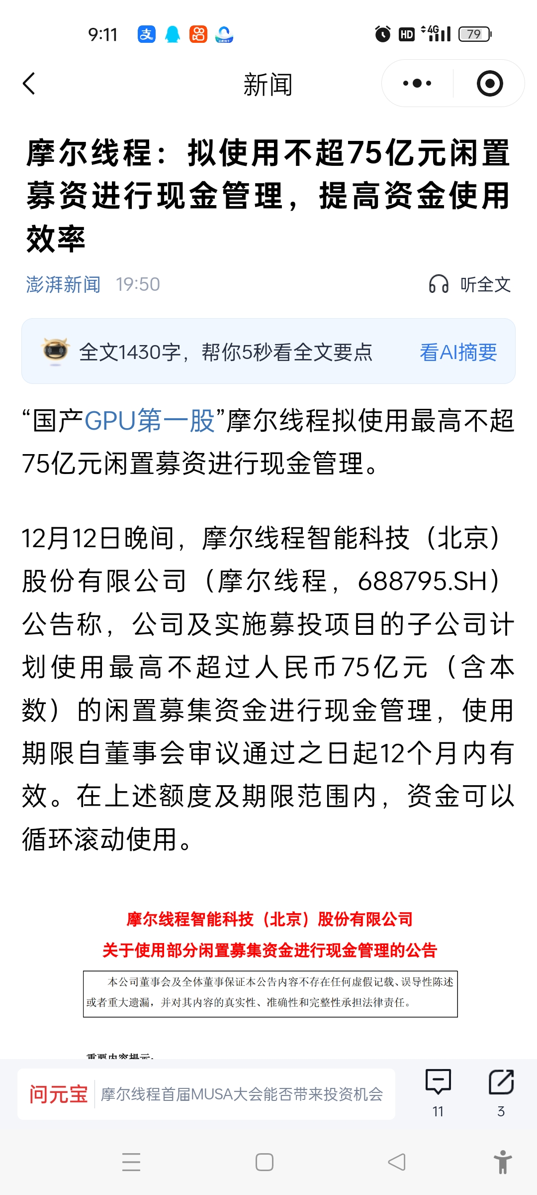 On the evening of December 12, Moore Threads Intelligent Technology (Beijing) Co., Ltd. (Moore Threads, 688795.SH) announced that the company and its subsidiaries implementing fundraising projects plan to use a maximum of 7.5 billion yuan (including this amount) of idle raised funds for cash management, with a usage period effective within 12 months from the date of approval by the board of directors. Within the limits and duration mentioned above, the funds can be used in a rolling manner.