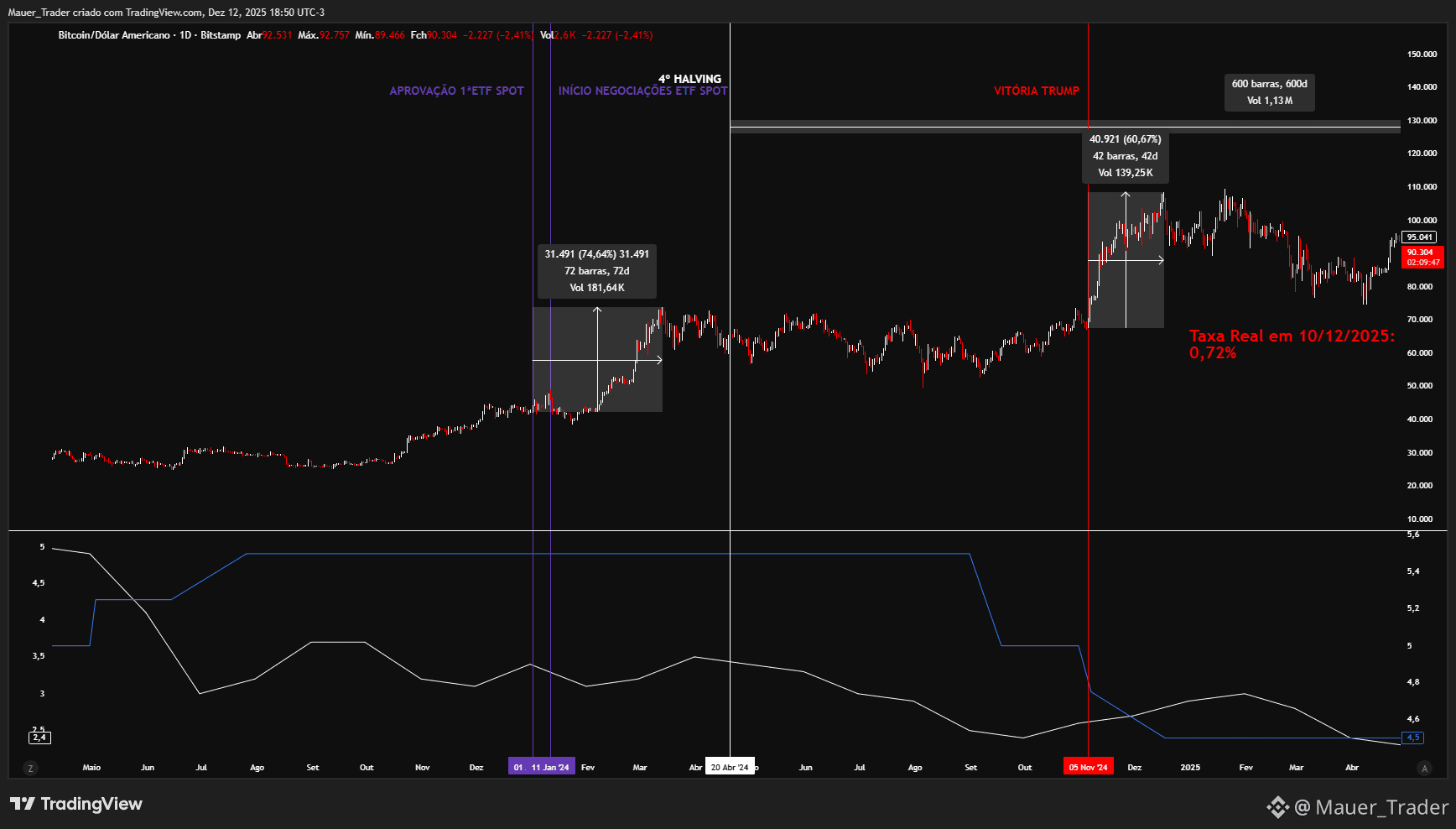 Se historicamente as ATHs ocorreram com juros reais negativos, esse único fator já sugere um ciclo mais lento e possivelmente deslocado no tempo.
