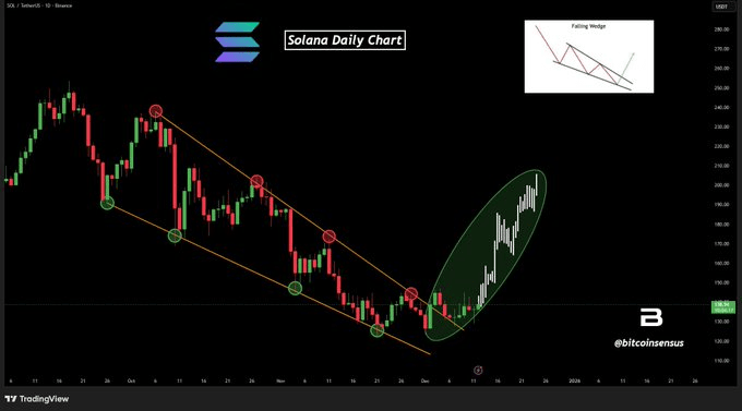 Solana’s daily chart confirms a breakout from a long-standing falling wedge formed during an extended corrective phase. The structure reflected diminishing downside momentum, with sellers losing control as successive lows showed weaker continuation.