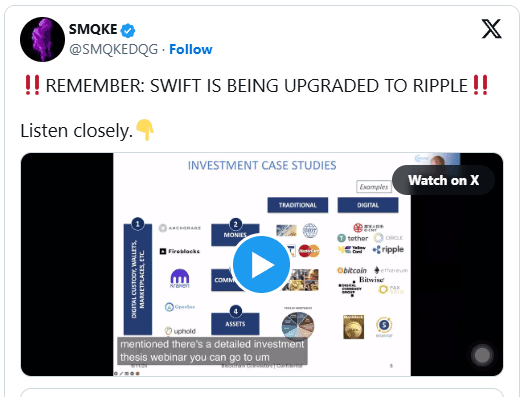 $XRP The cryptocurrency researcher SMQKE (@SMQKEDQG) has surprised the XRP community with a bold claim that SWIFT will be upgraded to Ripple. 🔄 I back this statement with a presentation by Matthew Le Merle 🗣️ that placed Ripple within a broader shift toward digital infrastructure. 🌐