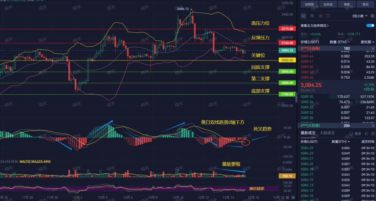 Tonight, ETH is more likely to follow a 'bottom-fishing fluctuation' trend, with the probability of a direct strong attack on 3150 being less than 20%. A greater possibility is to test 3000 downwards, even approaching the 2900 support area, accompanied by fluctuations triggered by news from whales.