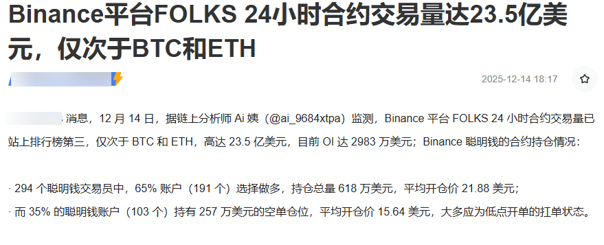 Data shows that FOLKS has dropped 40% in the last 24 hours, but its contract trading volume on Binance reached as high as 2.35 billion dollars. What does this indicate? There is significant capital in intense speculation. More critically, on-chain analysts found that among 294 'smart money' accounts, 65% are going long, with an average opening price of 21.88 dollars; only 35% are shorting, with an opening price of 15.64 dollars. This means that most 'smart money' believes: FOLKS has dropped to this point and is close to the bottom, a rebound could come at any time. But will the rebound really come?