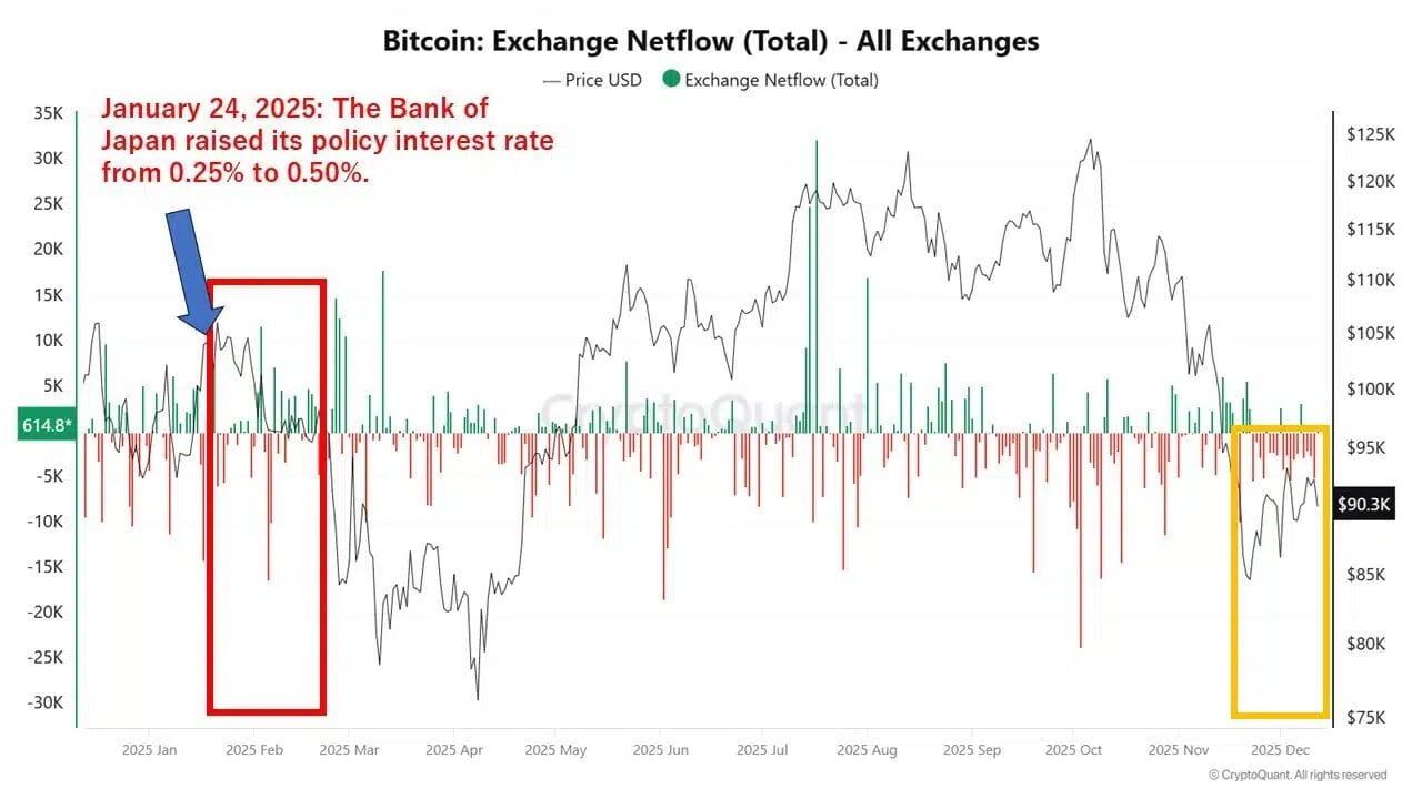 Recently, Bitcoin's price has started to feel the impact of next week's Bank of Japan (BoJ) policy decision. The market generally expects the BoJ to raise interest rates by 25 basis points, prompting traders to adjust their positions in advance. In other words, risk appetite is declining, and a sell-off may quietly unfold before the policy is officially announced.