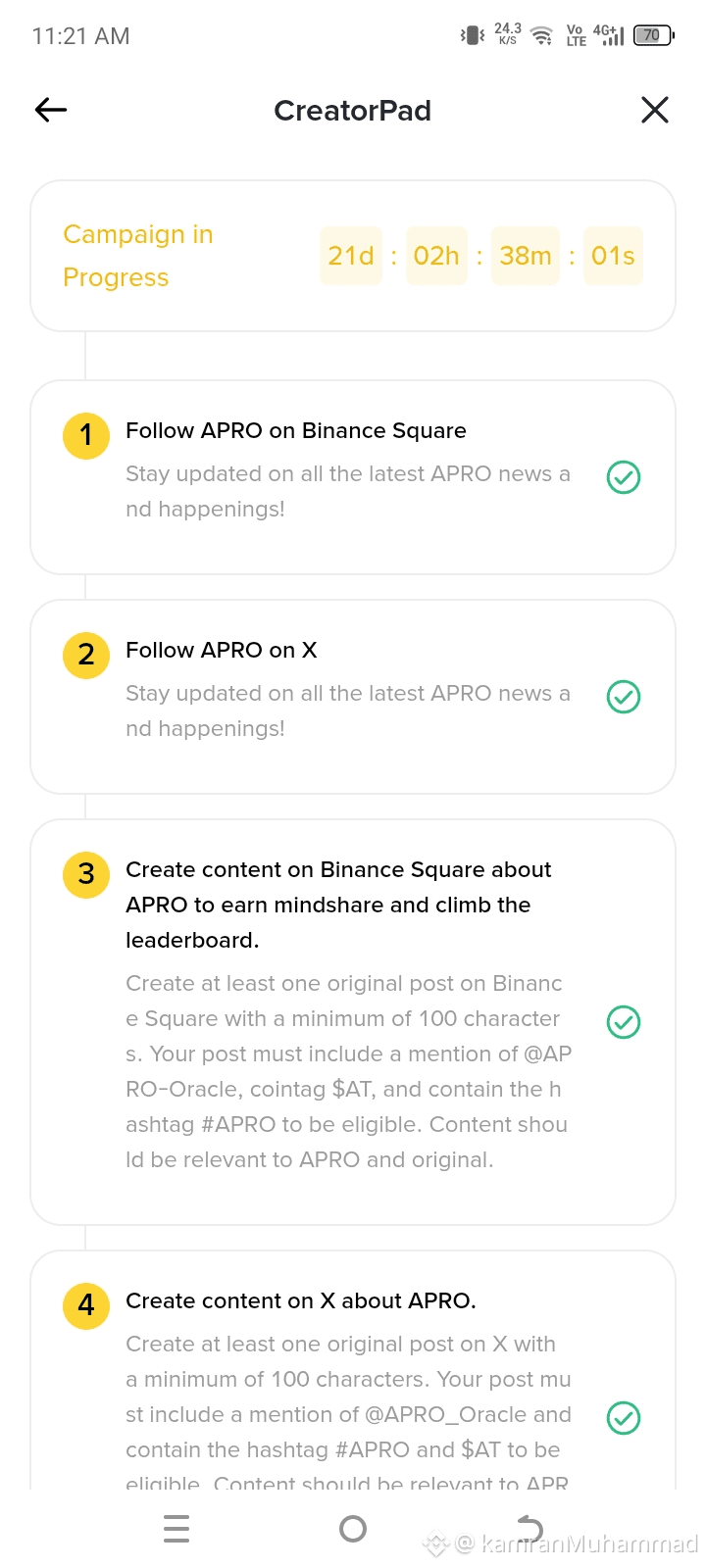 Create at least one original post on Binance Square with a minimum of 100 characters. Your post must include a mention of @APRO-Oracle, cointag $AT, and contain the hashtag #APRO to be eligible. Content should be relevant to APRO and original.