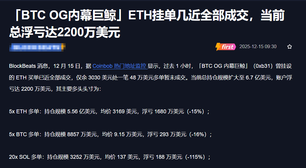 The ETH buy orders set by the BTC OG insider whale have nearly all been filled, with only one pending large order of $480,000 at $3030. This whale, with a total position size of $670 million, has current unrealized losses reaching an astonishing $22 million, of which the ETH long positions with 5x leverage have unrealized losses of $16.8 million.