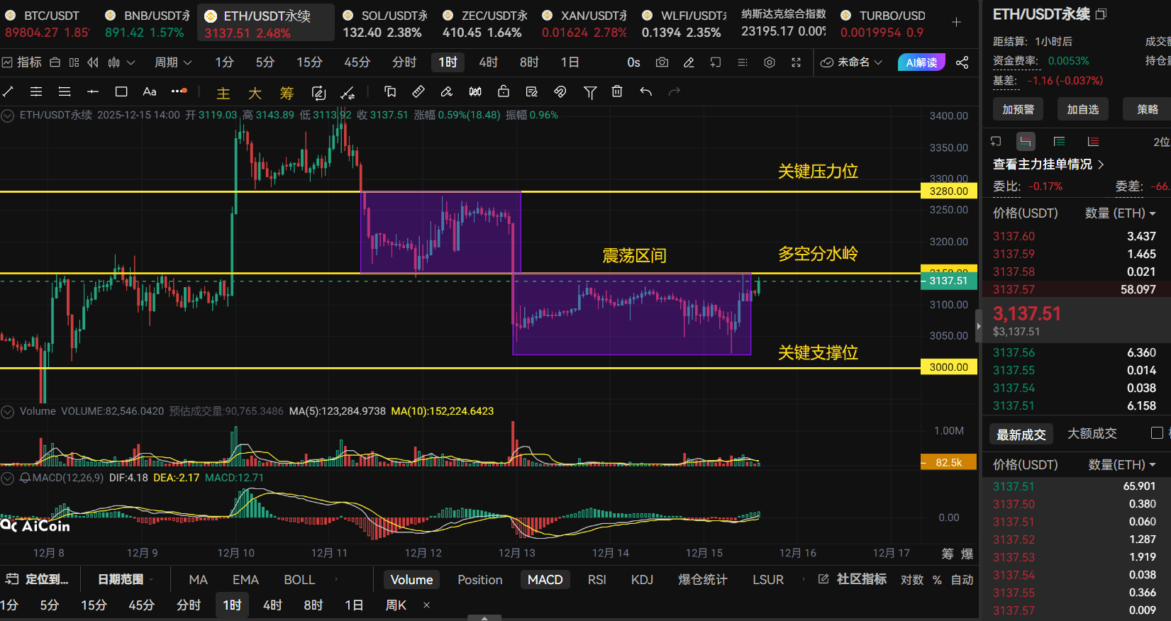 Bull-bear dividing line: $3150. This is the morning rebound high point and also the area of dense whale orders. If it stabilizes here, there may be a test of higher pressure in the short term; conversely, it confirms the end of the rebound.