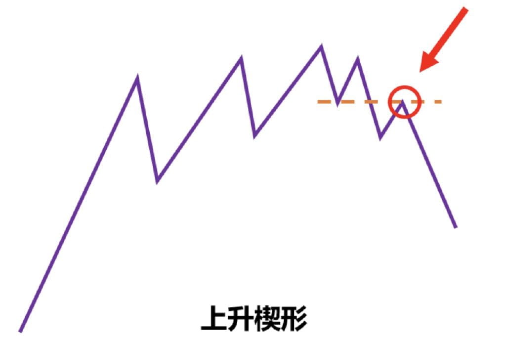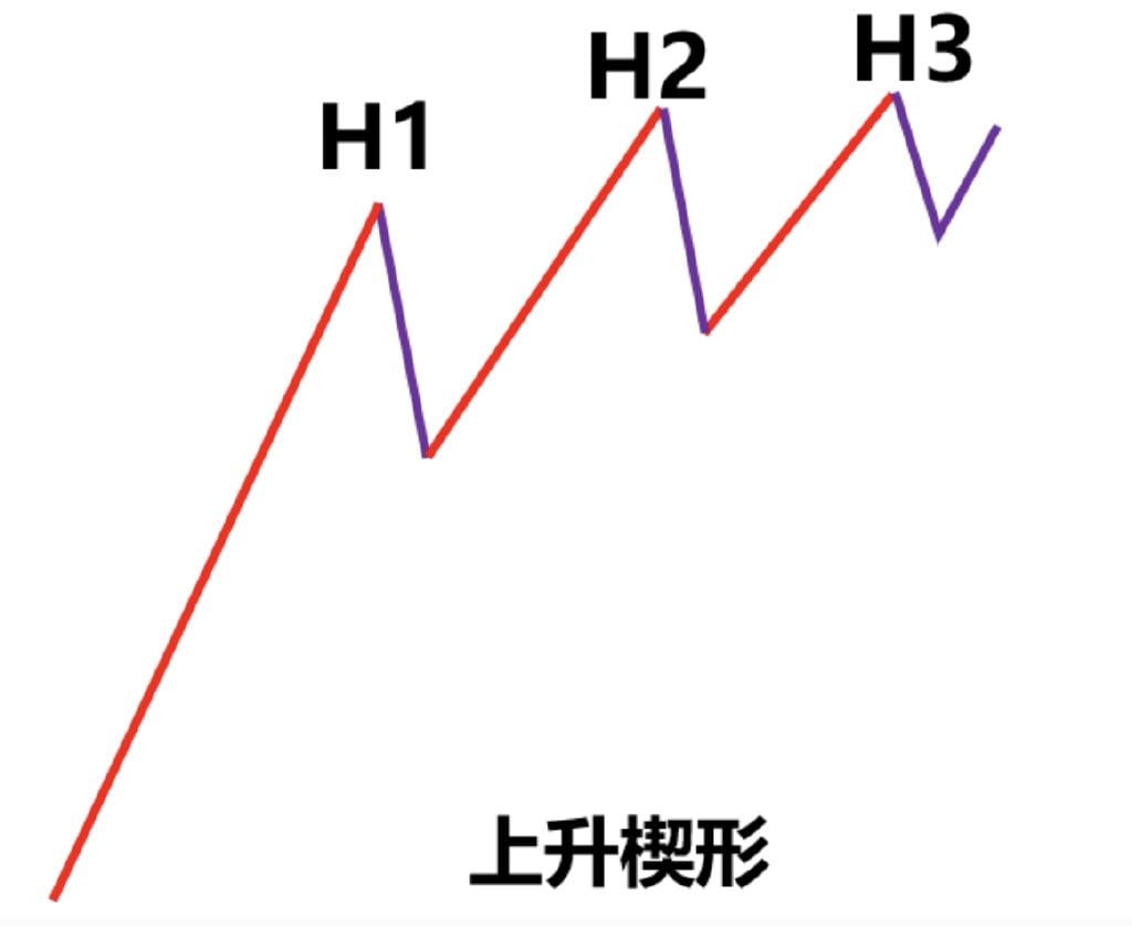Therefore, the ascending wedge pattern is a pattern of insufficient bullish momentum, and most of the time it pushes three times, meaning it has pushed up three times, so this pattern is also called a three-push wedge. Of course, there can also be two pushes and four pushes.