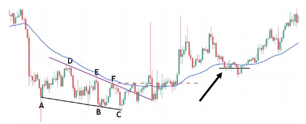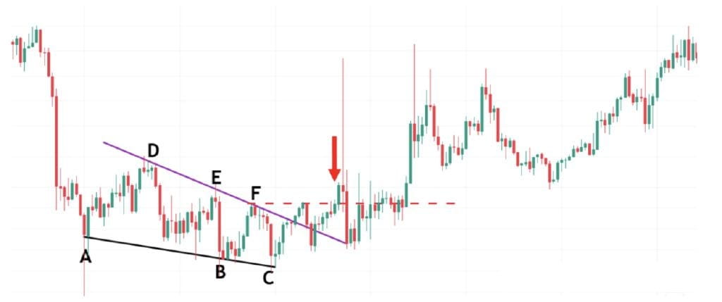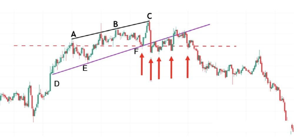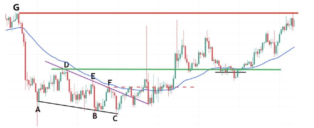 At the same time, connect points D, E, and F to form the trend line, while we draw a horizontal resistance line from point F.
