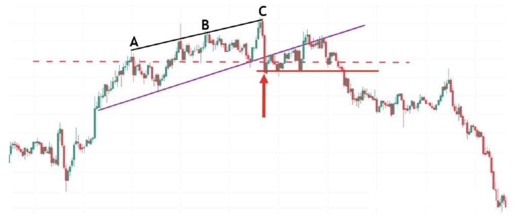 In fact, many traders will think that the bearish confirmation of this pattern will only be possible after the upward-sloping trend line is broken. At the time of the breakdown, the trading volume should expand or rise, which can be considered as confirmation.